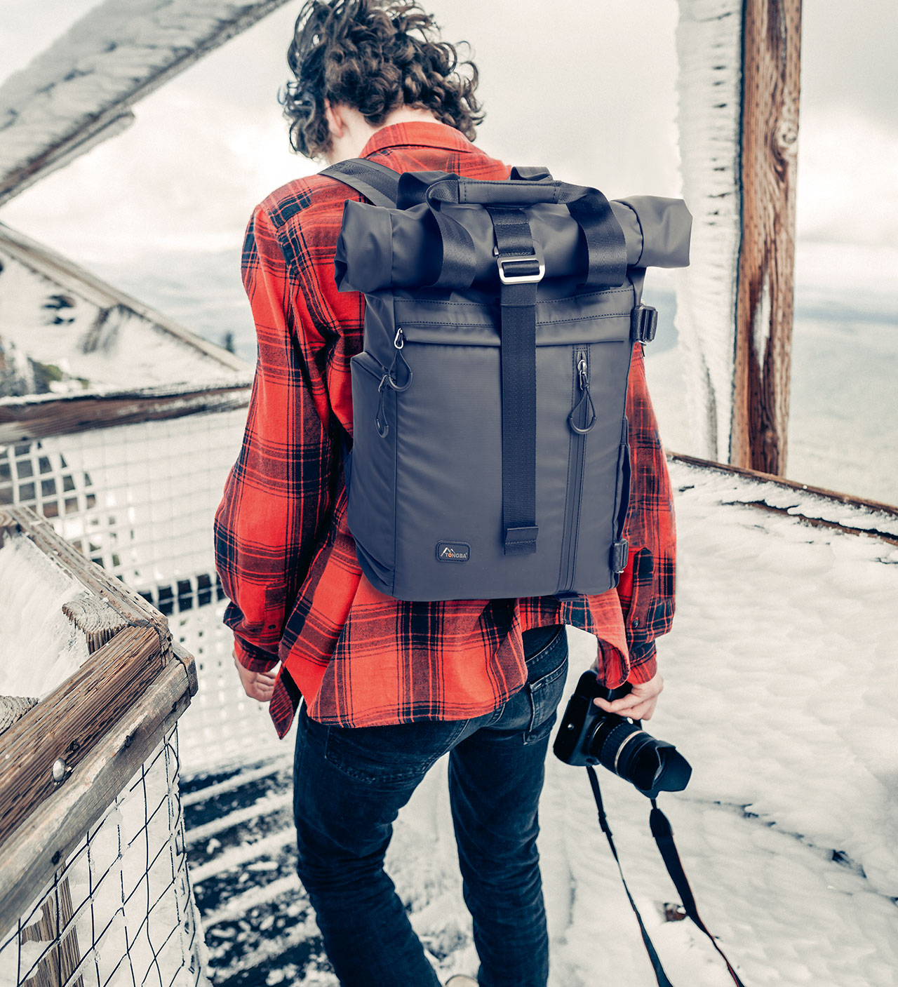 卷盖扩容,上下分仓;后开仓防盗,上下仓可打通;S型肩带,透气背负;腰带可拆卸,侧绑三脚架;采用汽车安全织带坚固牢靠;有侧开口可快速取机;后背有钱包证件口袋;防泼水拉链,宽大提手设计;配送腰带及防雨罩。